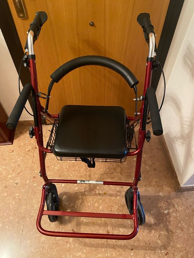 Detalles del productoAndador de color rojo burdeos, con asiento acolchado negro y cesta portaobjetos. Está en buen estado.