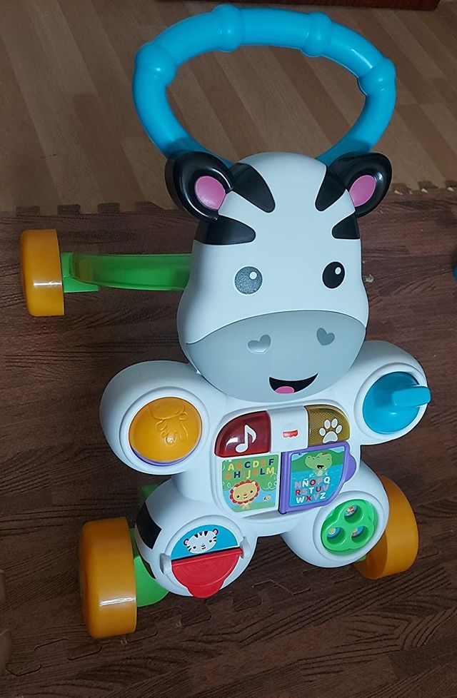 Detalles del productoAndador correpasillos Cebra parlanchina de Fisher Price. Con actividades para que el niño juegue sentado. Incluye un libro con una página que se puede pasar y botones luminosos que activan canciones y frases sobre las letras y los números. Ideal para dar sus primeros pasos. También dice frases.
