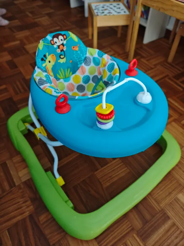 Andador Bright Starts, Andador Primeros Pasos Plegable para Bebés, altura ajustable, asiento extraíble, lavable a máquina, a partir de 6 meses. Tiene poco uso, está como nuevo y se a limpiado y desinfectado para la venta.