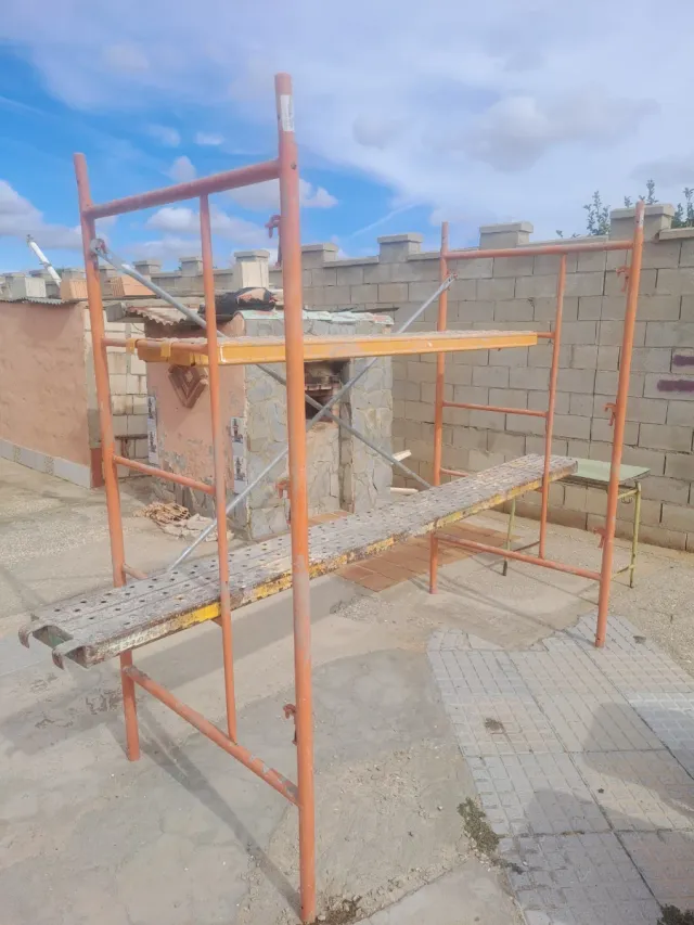 Detalles del productoAndamio de construcción con dos chapas y dos carretillas de mano.