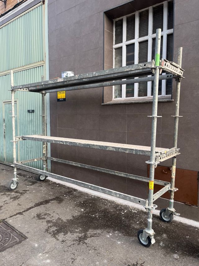 Detalles del productoAndamio europeo de metal, ideal para trabajos en altura. Cuenta con una estructura robusta y ruedas para facilitar su movilidad.