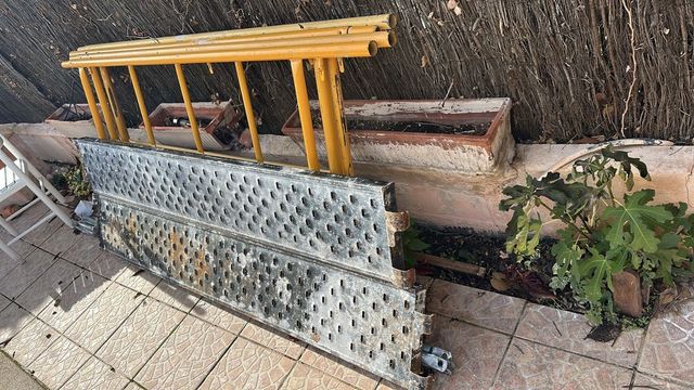 Plataforma de andamio metálico con estructura amarilla. - Superficie perforada para mayor agarre. - Ideal para trabajos en altura.