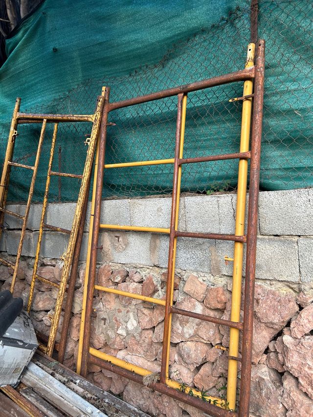 Estructura de andamio metálico, ideal para trabajos en altura. Se compone de 4 modulos de 1,05m de ancho x 2m de altura ,3 bandejas metalicas, 3 tijeras,y 2 patas regulables