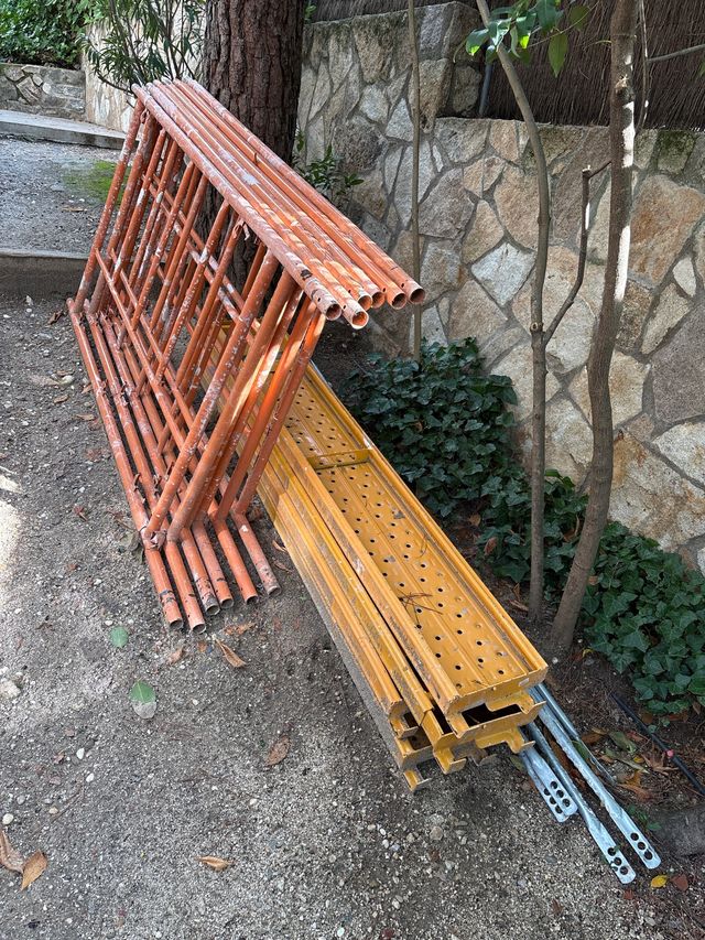 Detalles del productoSe venden piezas de andamio, incluyendo estructuras metálicas y plataformas.