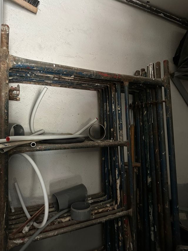 Detalles del productoConjunto de andamios metálicos, ideales para trabajos de construcción.