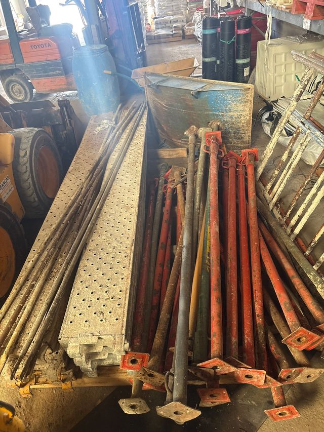 Lote de material de construcción para andamios. - Planchas metálicas perforadas. - Puntales de carga ajustables. - Carretilla amasadora.