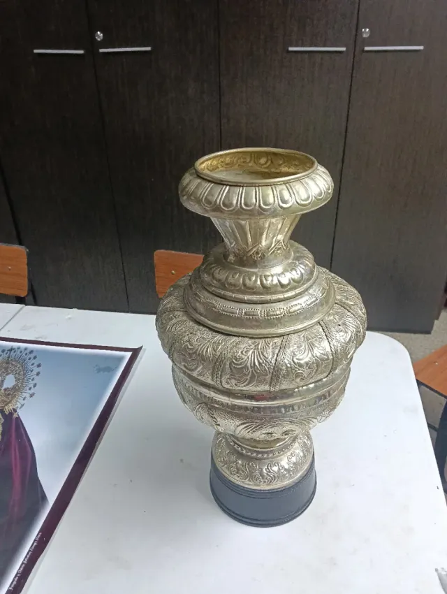2 Anforas de metal cofrade de 50ctm labradas buen estado aunque han perdido un poco el cromado