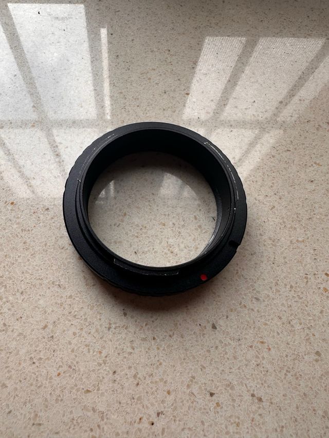 Anilla adaptadora T2 para astrofoto con Canon. - Material: Metal negro. - Indicador de alineación rojo.