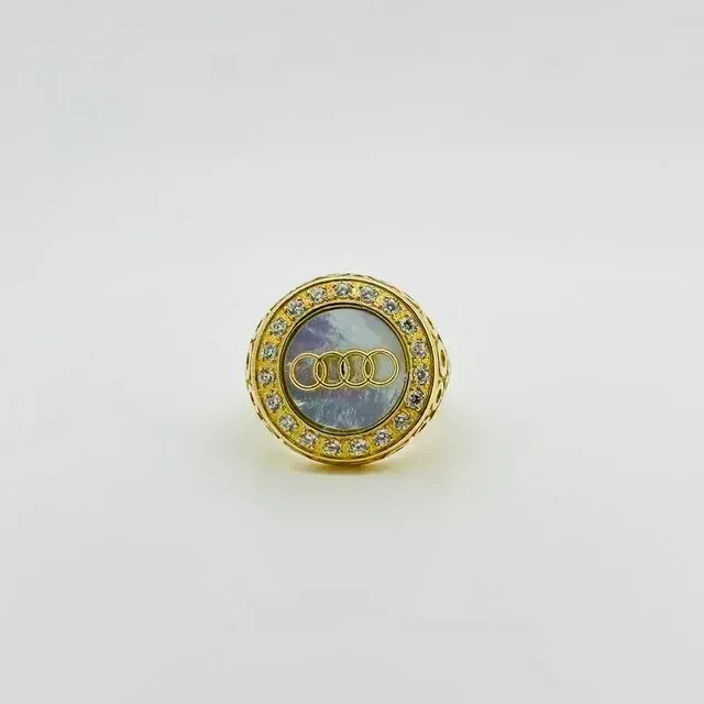 SELLO REDONDO AUDI CON NACAR Y CIRCONITA. Hueco. Oro 18k.