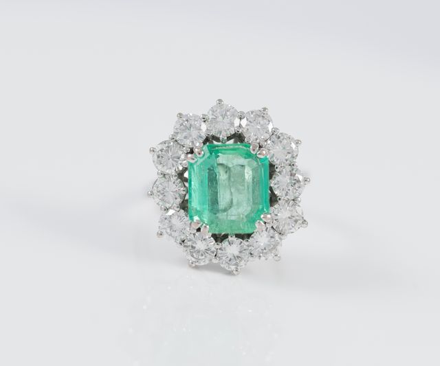 Anillo en oro blanco 18k con esmeralda y diamantes