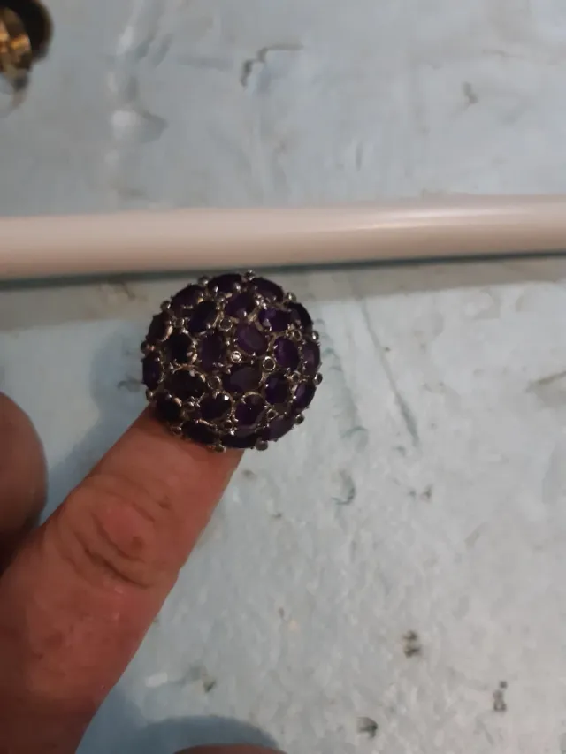 Anillo con un diseño esférico adornado con múltiples piedras moradas y detalles plateados.
