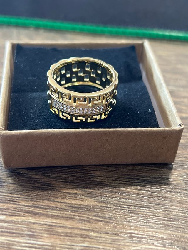 Elegante anillo laminado en oro de 14 quilates con un diseño intrincado y detalles brillantes.