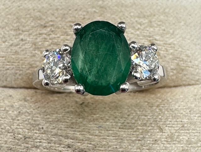 Anillo de oro de 18 kt con diamantes talla brillante y esmeralda talla oval.