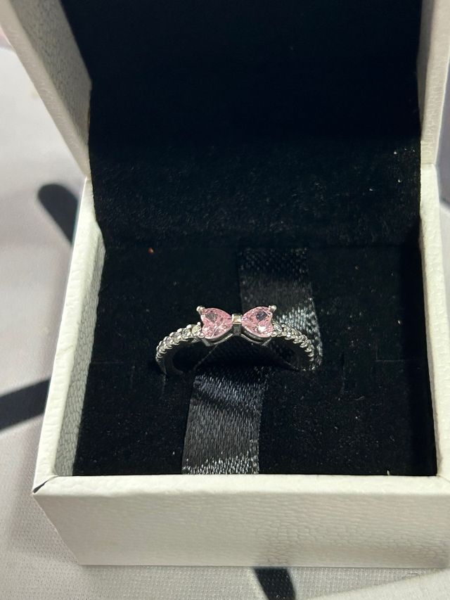 Anillo de Pandora con un diseño de lazo. - Detalles brillantes. - Color rosa y plateado.