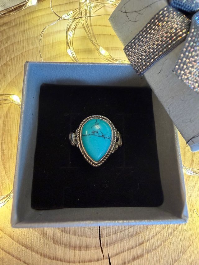Elegante anillo con un diseño de gota y una piedra turquesa.