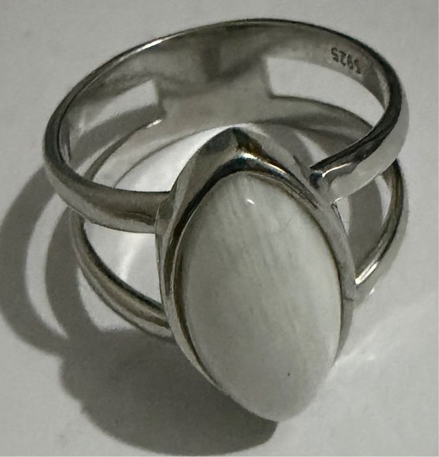 Elegante anillo de plata con una piedra central ovalada de color blanco. Un diseño clásico y refinado.