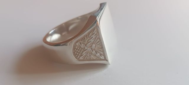 Elegante anillo de sello en plata con un diseño grabado en uno de sus laterales.