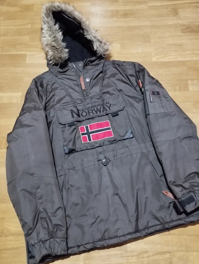 Anorak Geographical Norway de color marrón con capucha y forro en la capucha con pelo.