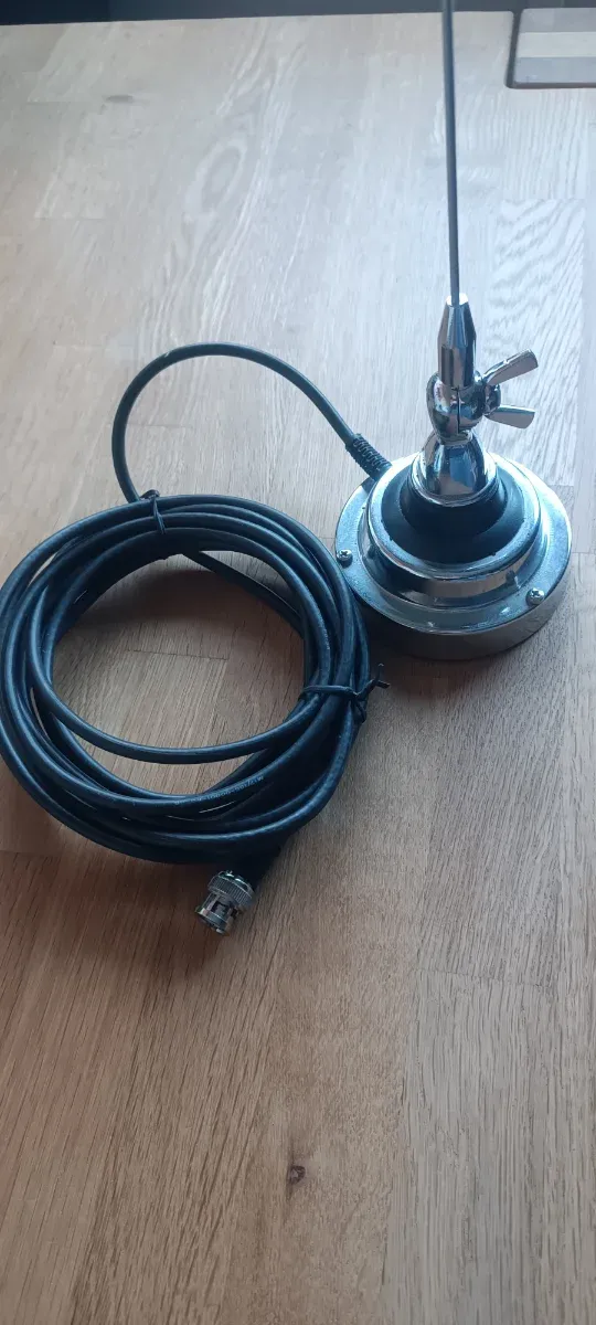 Antena para coche con conexión UHF/VHF. Incluye cable y conector. - Base magnética metálica cromada. - Varilla de antena metálica. - Cable negro enrollado.