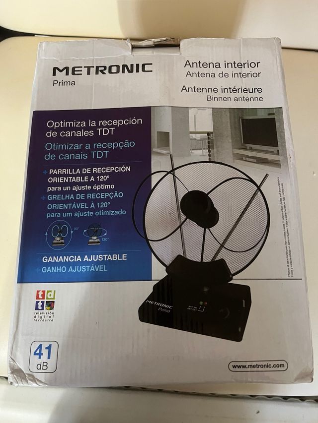 Detalles del productoAntena interior Metronic Prima para optimizar la recepción de canales TDT. Permite orientar la parrilla de recepción hasta 120° para un ajuste óptimo.