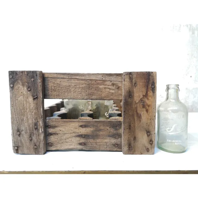 Detalles del productoCaja de madera antigua para coleccionista. Con ocho botellas serigrafiadas de batido de leche Sali. 250 ml. 15 cm de alto.