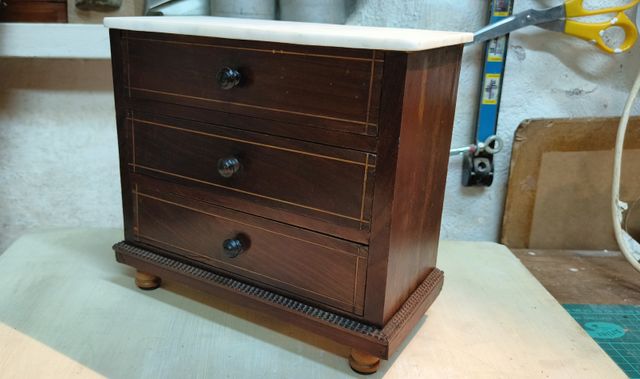Detalles del productoPreciosa miniatura de cómoda antigua,llamada "de Maîtrise" datada a finales del siglo XIX. Realizada en caoba y de formas rectilíneas. Presenta tres cajones frontales con tiradores igualmente en madera que abren y cierran sin dificultad.