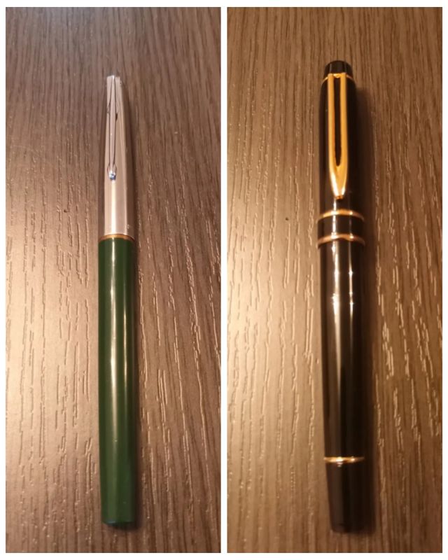 Antigua Estilográfica GOLDEN STAR 535. Años 70-80. Fabricada en China. Pieza rara. Capuchon y clip en acero inoxidable cromado. Terminación superior perleada negro. Grabado de la marca en base del Capuchon. Cierre a presión. Cuerpo y agarre en resina plástica. Sistema de carga por cartucho. Plumín en acero inoxidable. Punto de trazado Fino. En magnífico estado. Funcionamiento correcto.