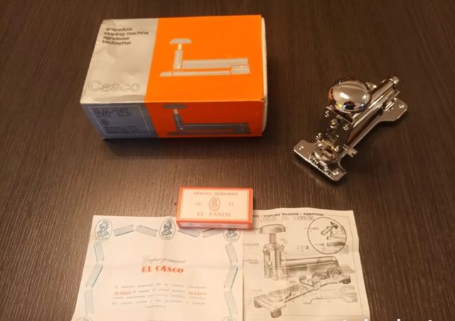 Detalles del productoAntigua Grapadora de sobremesa EL CASCO M-15. Años 70-80. Fabricado en España. Cuerpo es en acero pulido a mano y bañado en niquel, cromo y cobre. Protección del cargador y patas de goma. Capacidad de grapado; 25 hojas. Capacidad de carga: 100 grapas. Usa grapas 22/6. Profundidad de entrada de papel: 8 cm. Caja, grapas e instrucciones originales. A estrenar e impecable. Funcionamiento perfecto