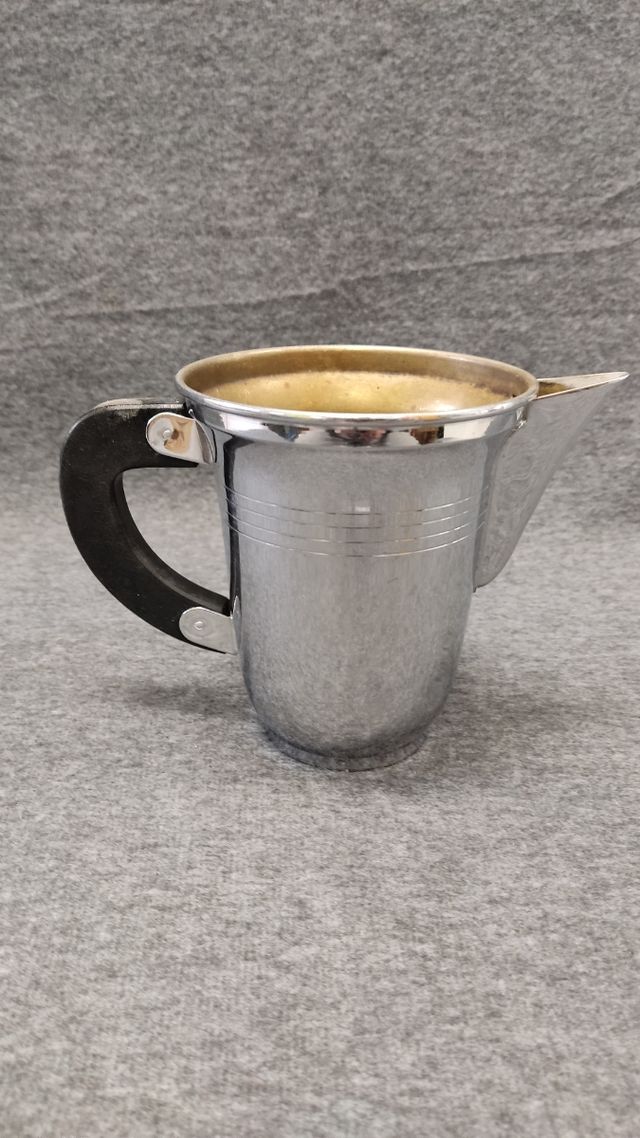 Detalles del productoAntigua pequeña lechera de latón cromado con asa de madera pintada de negro o baquelita (no lo distingo bien), tiene alguna pequeña abolladura y en el interior ha perdido el cromado y se ve el latón. Ver dimensiones y estado en las fotos. Es bonito para utilizar como florero o para uso decorativo. Art decó, Mid-Century Modern