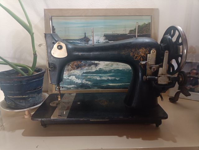 Antigua maquina de coser. Funcionan todos los mecanismos. Ha perdido parte de la pintura dorada, pero tiene una bonita patina. Pesa bastante.