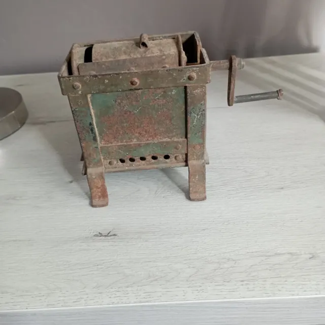 Detalles del productoMáquina antigua para tostar café, con un diseño robusto y un acabado metálico que muestra el paso del tiempo.