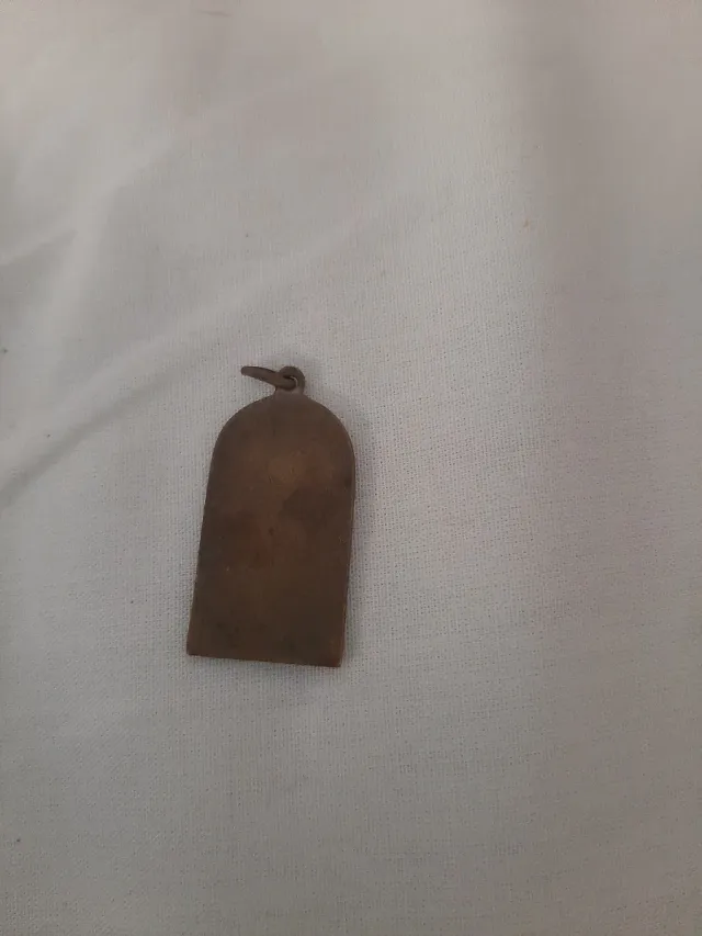 Medalla antigua con un diseño clásico. - Material metálico. - Forma de campana con asa.