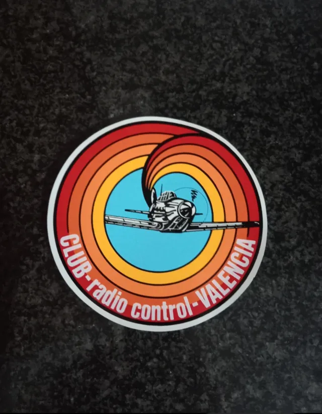Detalles del productoPegatina aeromodelismo circular del Club Radio Control Valencia. Presenta un diseño retro con un avión surcando un cielo azul rodeado de círculos concéntricos en tonos naranjas y rojos.