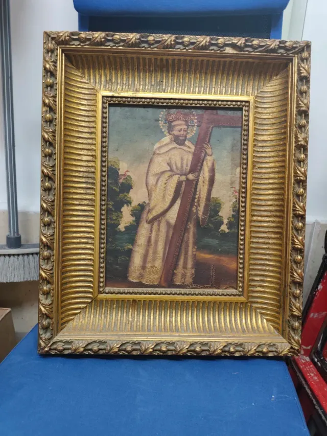 Detalles del productoMarco antiguo para pintura religiosa. El marco presenta un acabado desgastado y detalles de pintura descascarada.