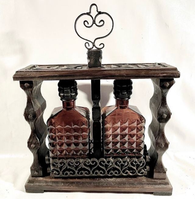 ANTIGUA TANTALO LICORERA DE DOS BOTELLAS MADERA TALLADA Y FORJA MUY BUEN ESTADO