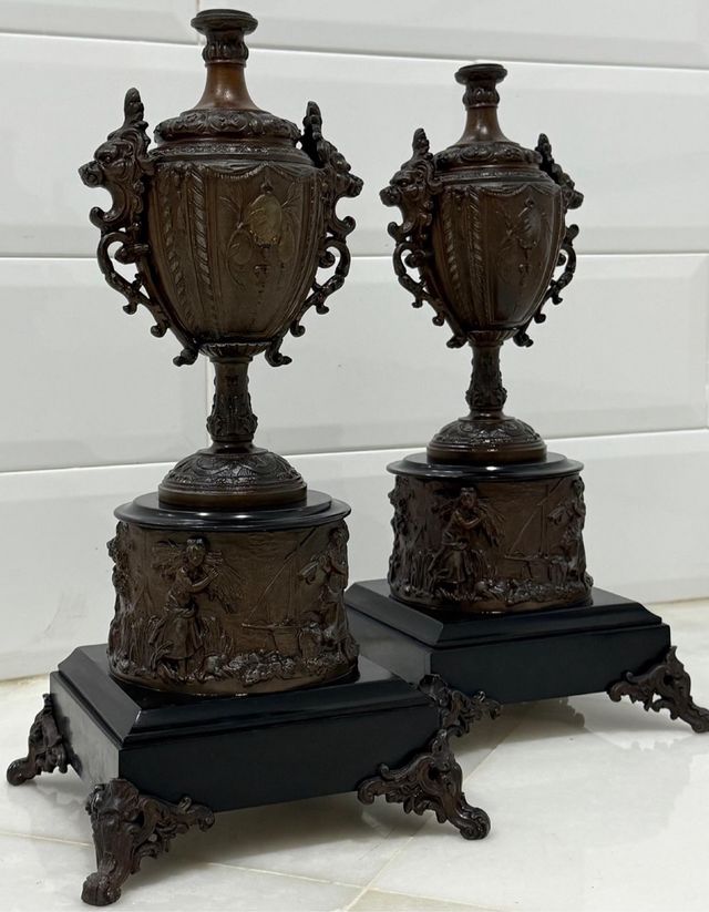 Detalles del productoAntigua y espectacular pareja de copas/cassolettes de origen francés de mediados del siglo XIX y estilo Napoleón III realizadas en metal zinc técnico sobre base de mármol negro de Carrara alzadas sobre 4 patas en bronce macizo. Decorada con escenas de la época y asas con formas de cara de león y todo original de época. Unas piezas de colección elegantes y únicas que decorarán cualquier rincón dando distinción. Véanse las fotografías para hacerse una mejor idea de los detalles que forman parte de la descripción. Medidas: 43 cms de alto, 21 cms de ancho y 20 cms de fondo.
