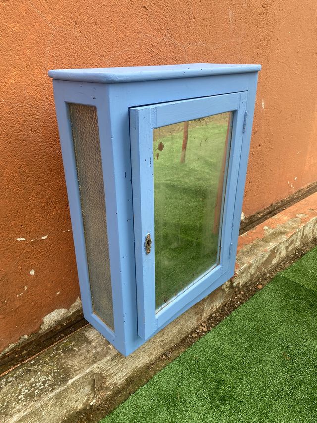 Antiguo armario de madera para el baño para colgar en la pared, pintado en color azul con pintura a la tiza. En buen estado de conservación precio 250 €