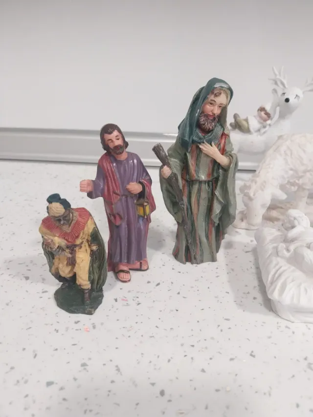 Conjunto de figuras para un belén de Navidad antiguo. Incluye varias piezas con detalles. - Figuras de personajes. - Elementos decorativos.