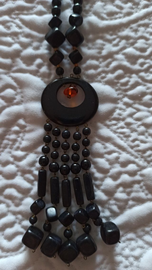 Antiguo collar artesano de madera, con una cuenta central de ámbar del Báltico