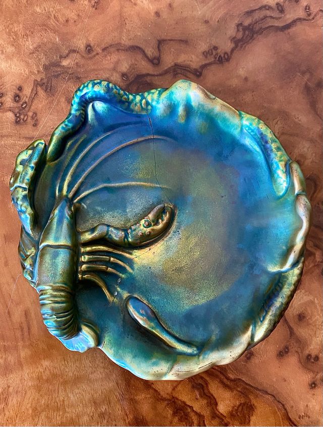 Detalles del productoAntiguo cuenco tipo cenicero Art Déco realizado artesanalmente por Zsolnay(Hungría) en Eosina verde sobre dorado,primer tercio de siglo XX,en el se representa una langosta,muy bien restaurado,ya que sufrió una rotura completa y por arriba apenas se ve un pelo, por abajo algo más notoria