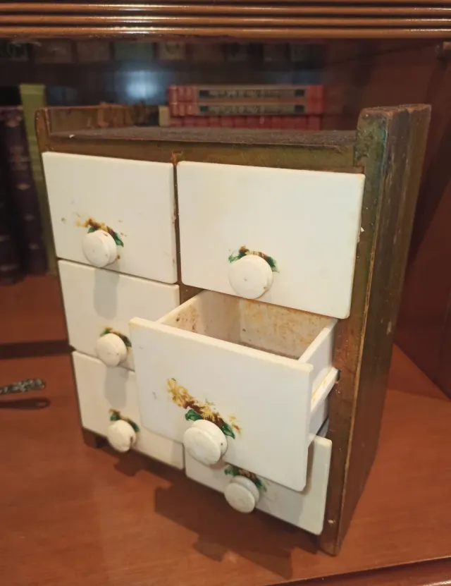 Detalles del productoEspeciero antiguo de madera con un diseño vintage.
