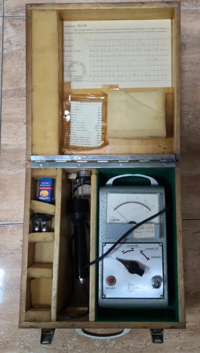 Detalles del productoInstrumento antiguo de medición de humedad, marca ELIN. Se presenta en su caja de madera original con compartimentos para accesorios.