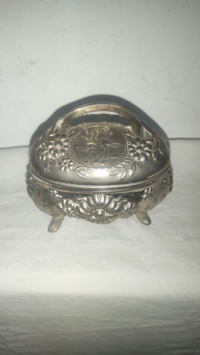 Detalles del productoAntiguo joyero, caja de joyas frances de estaño y zinc (cinc) plateado con tapa Art Nouveau. Hecho artesanalmente en Francia a principios mediados del siglo XX. Con hermosa forma ovalada y diseño de hojas. Forrado interiormente de bonito, suave terciopelo granate. Vintage.