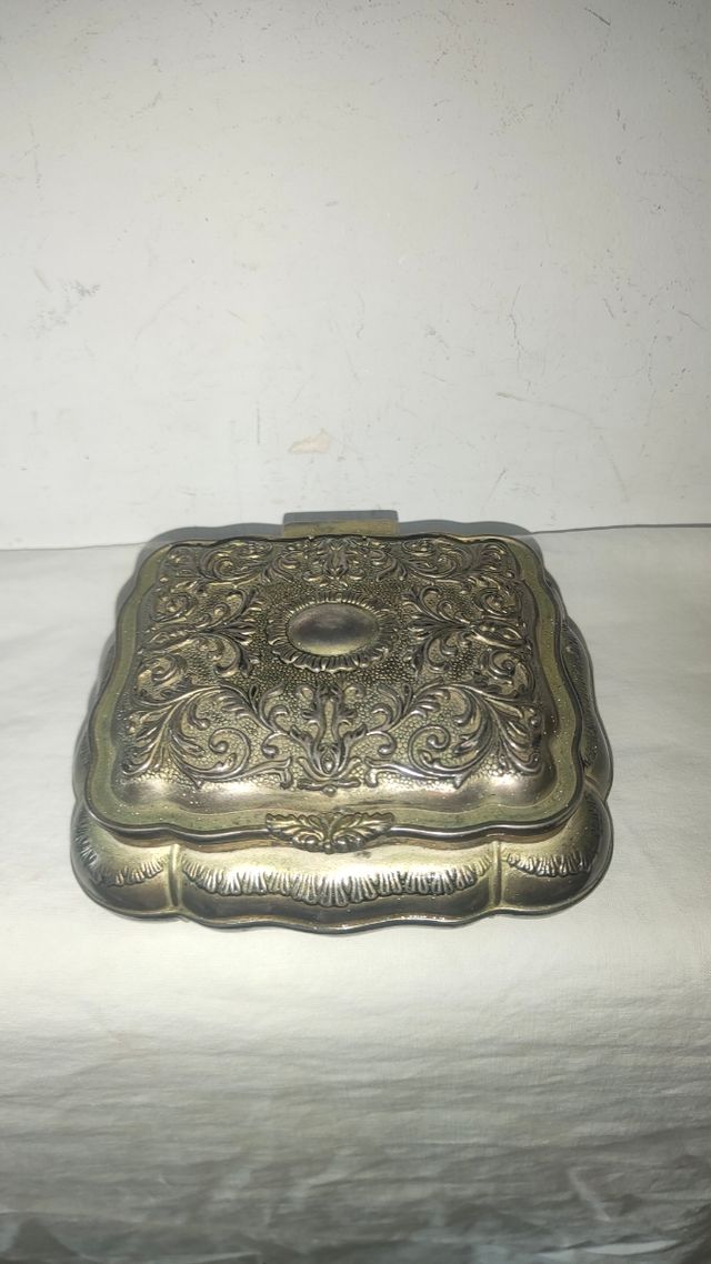 Detalles del productoAntiguo joyero, caja de joyas francesa de estaño y zinc (cinc) plateado y repujado, con tapa. Hecho artesanalmente en Francia en 1900. Con hermoso diseño de vid en relieve rodeándolo, con hojas, tallos, uvas y forma redondeada. Forrada interiormente con posterioridad de una bonito y suave tela blanca. Vintage. Gran peso.
