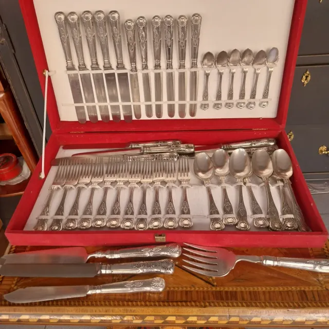Detalles del productoElegante juego de cubertería antigua presentado en un estuche rojo.