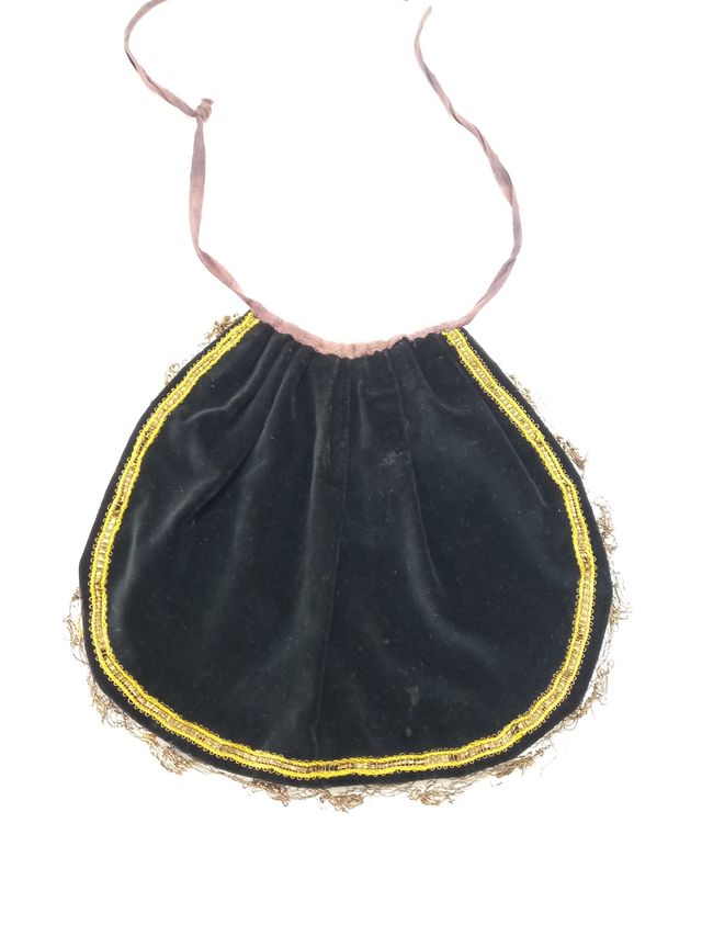 Detalles del productoMuy antiguo delantal o mandil infantil de traje regional o imagen religiosa. De terciopelo negro, con pasamanería y encaje de hilo de oro alrededor. Mide 24cm largo y 29cm ancho (por la parte más ancha).