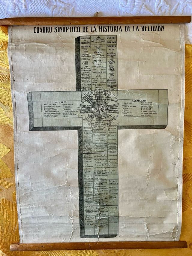 Detalles del productoAntiguo cuadro sinóptico sobre la historia de la religión sobre papel , con un diseño en forma de cruz.