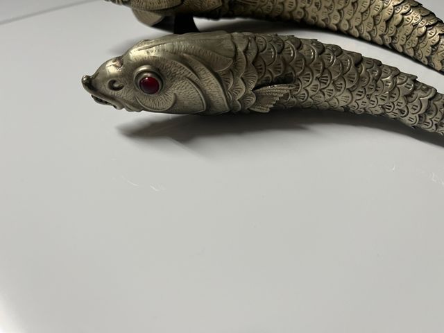Detalles del productoDetalle de un antiguo pez decorativo elaborado en alpaca. Su diseño escamado y los ojos de cristal rojo le otorgan un aspecto llamativo.