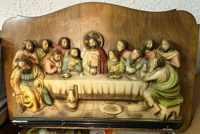 Detalle de La Última Cena en relieve. - Representación artística de la escena bíblica. - Marco de madera. - Figuras policromadas.