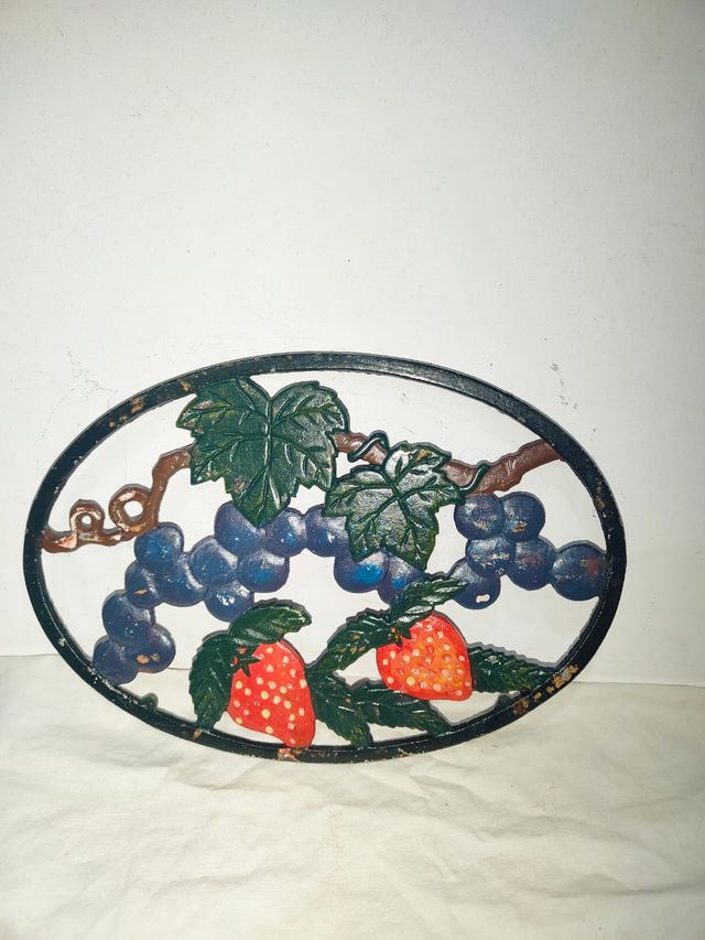 Detalles del productoAntiguo y bonito salvamantel, salvamanteles, reposaollas reposa ollas de hierro fundido esmaltado con un hermoso diseño colorido con adornos de fresas, hojas de parra y uvas. Tamaño grande. Hecha a mano artesanalmente. Gran peso.